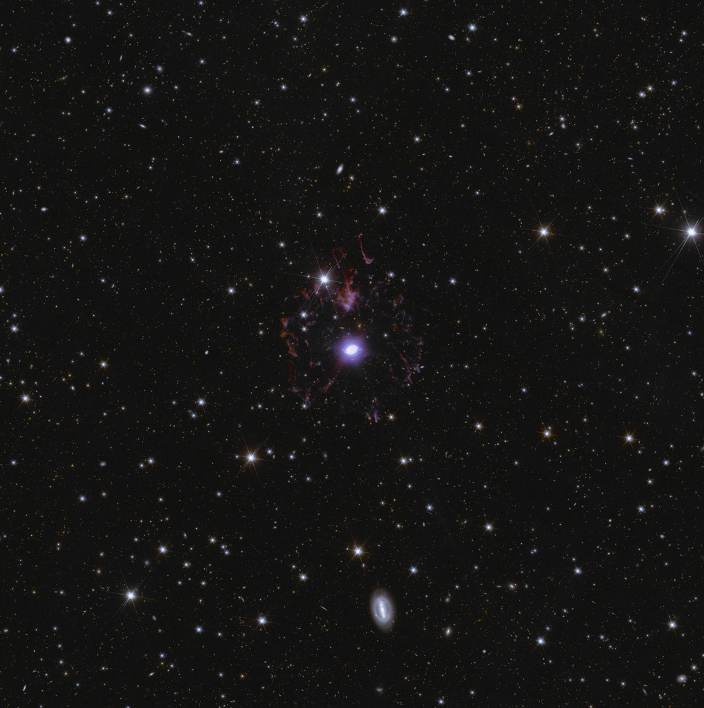 This is a zoom-in of Euclid’s Deep Field North, showing the Cat’s Eye Nebula in the center of the image, around 3000 light-years away. Also known as NGC 6543, this nebula is a visual ‘fossil record’ of the dynamics and late evolution of a dying star. This dying star is shedding its outer colorful shells.
